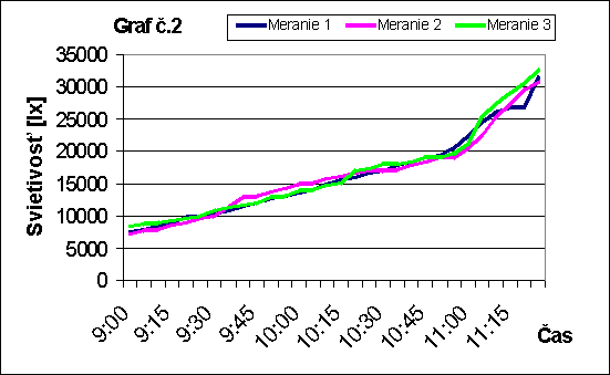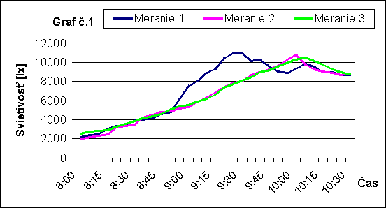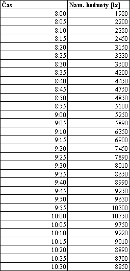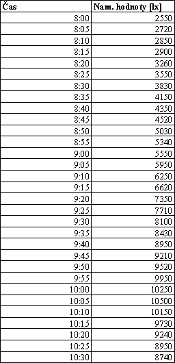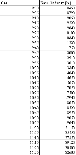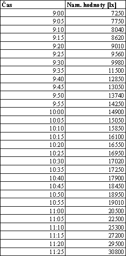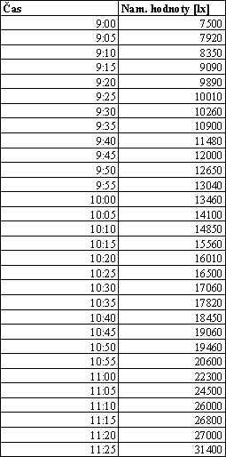 Intenzitu difúzneho žiarenia som merala v troch dňoch 19, 21.01.2001 a 07.03.2001. Merania boli vykonané digitálnym luxmetrom 0500, hodnoty boli namerané a zaznamenané v päťminutových intervaloch.